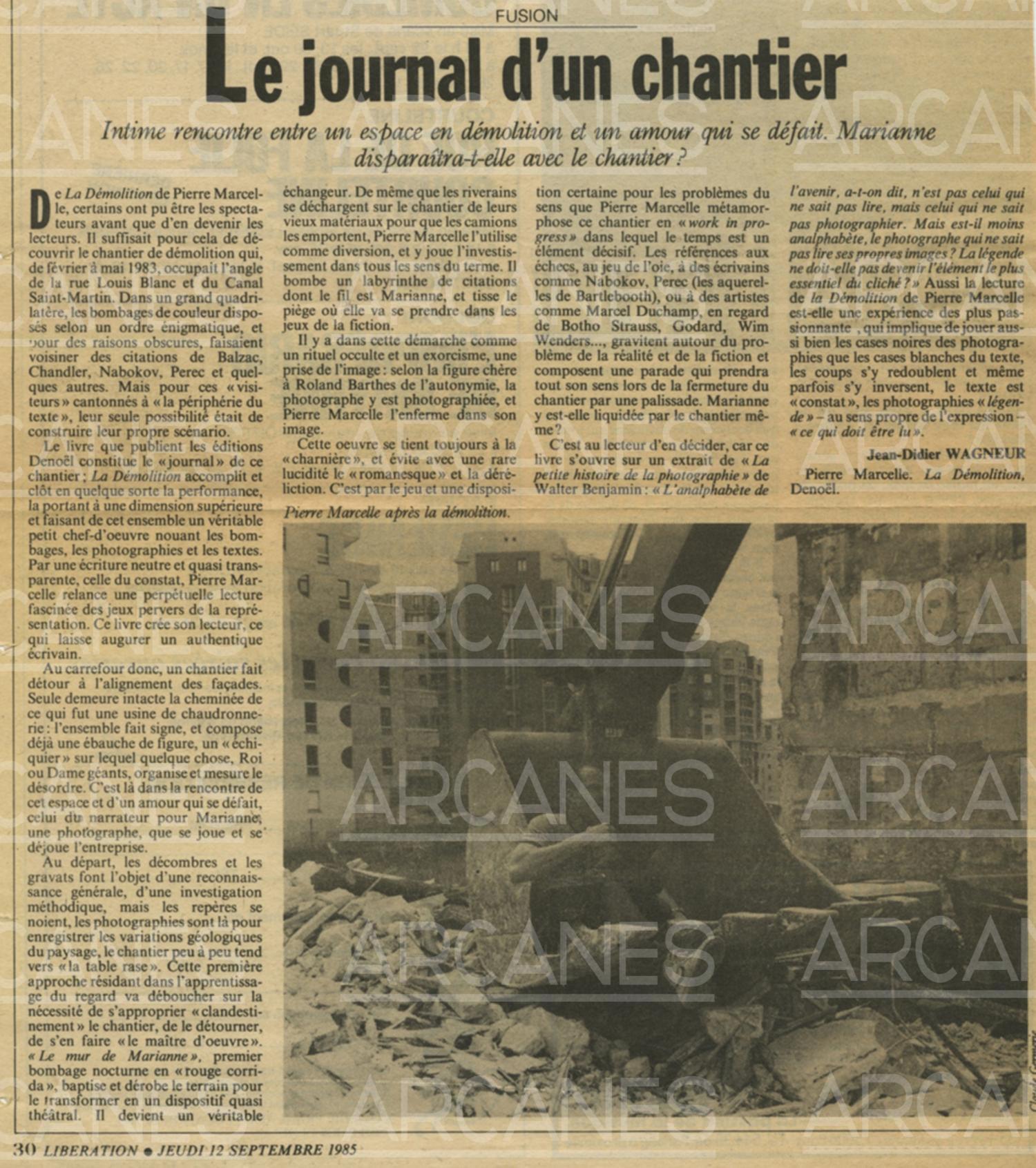 Article à propos de l'ouvrage La Démolition de Pierre Marcelle paru dans le journal Libération du 12 septembre 1985. Il est question dans cet ouvrage de graffitis vernaculaires réalisés dans un terrain vague du XIXe arrondissement de Paris.
