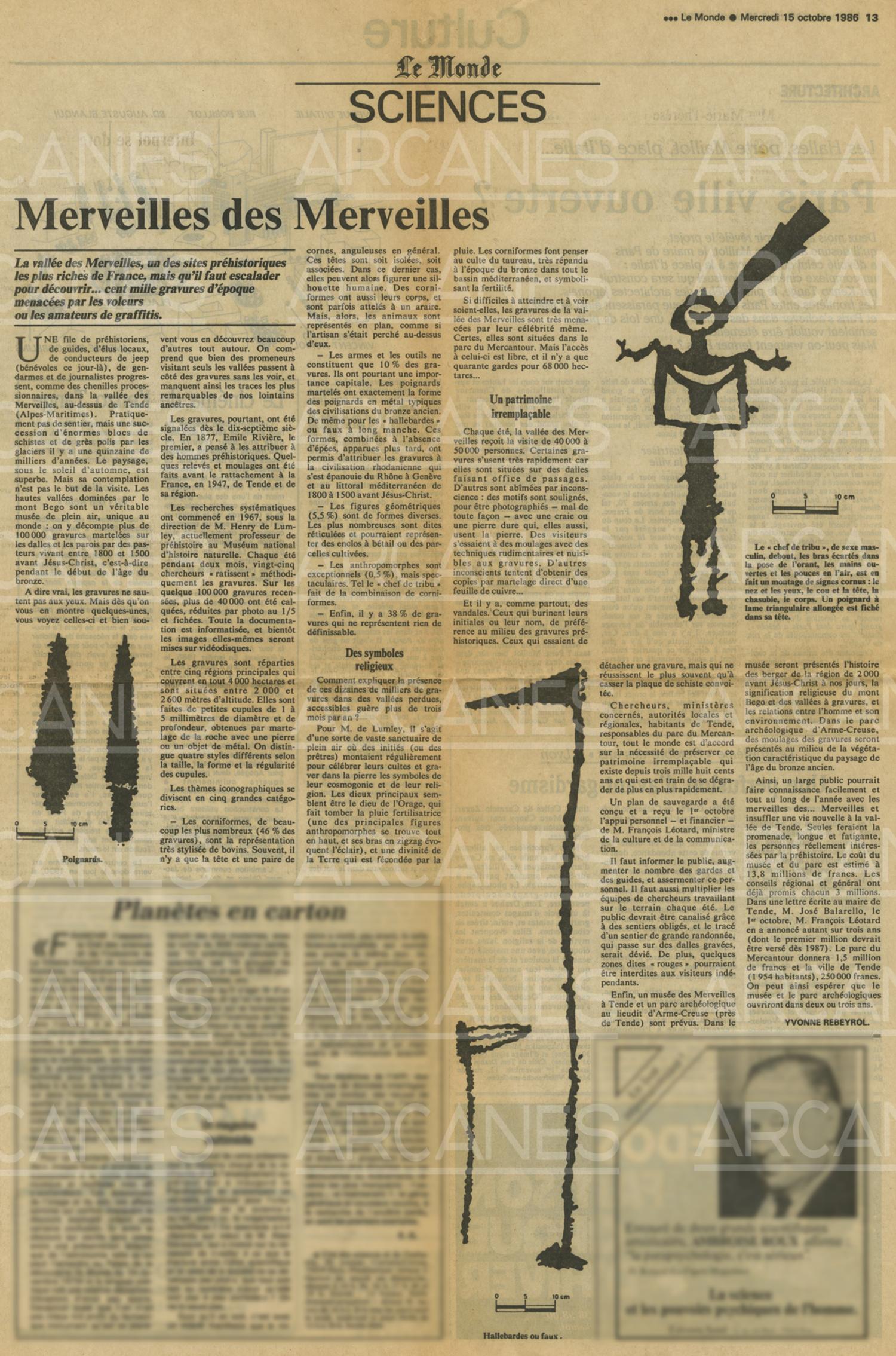 Article consacré aux graffitis préhistoriques de la vallée des Merveilles paru dans le journal Le Monde du mercredi 15 octobre 1986.